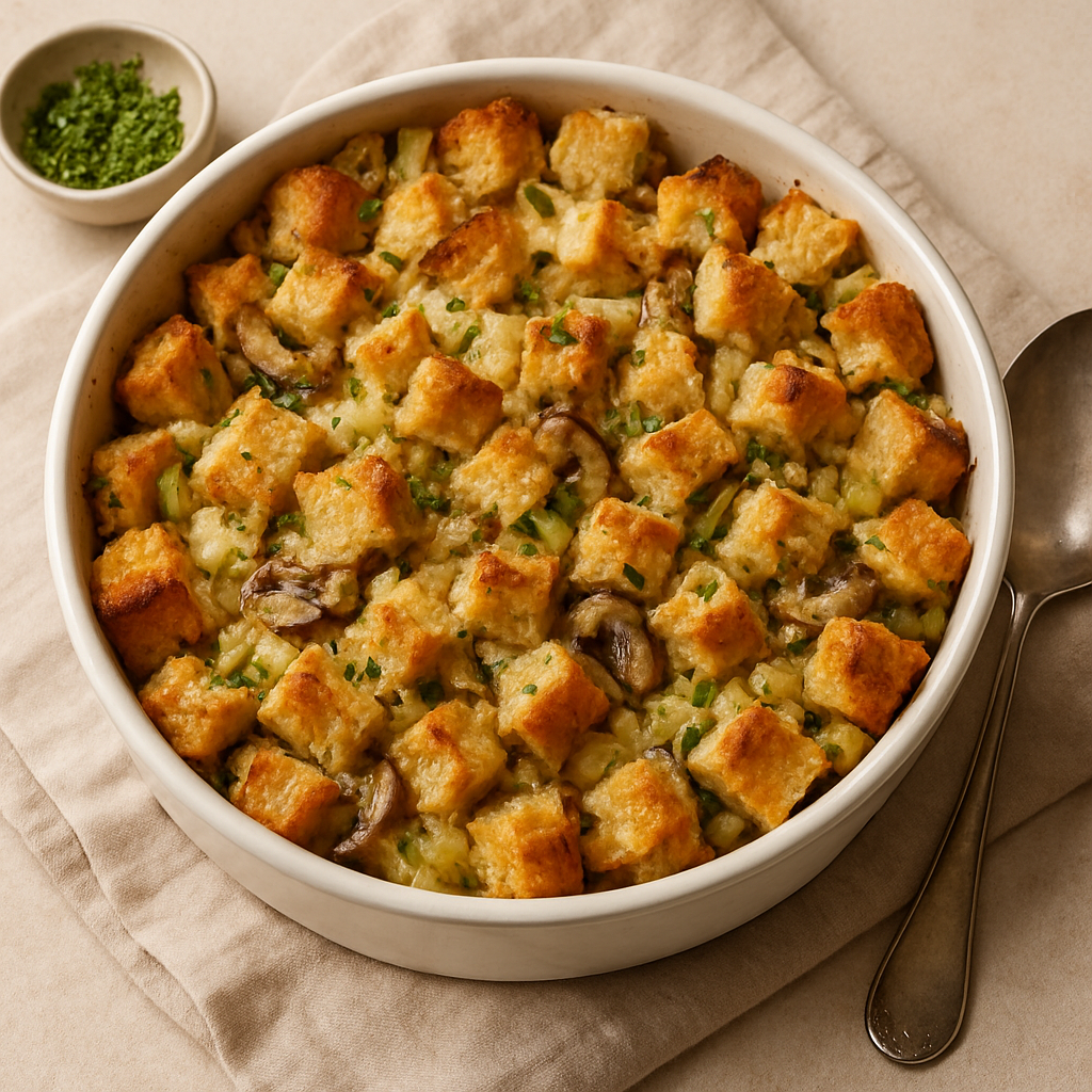 Classic Thanksgiving stuffing baked with herbs, celery, and onions. Fluffy inside, crispy on top, and full of comforting holiday flavor.