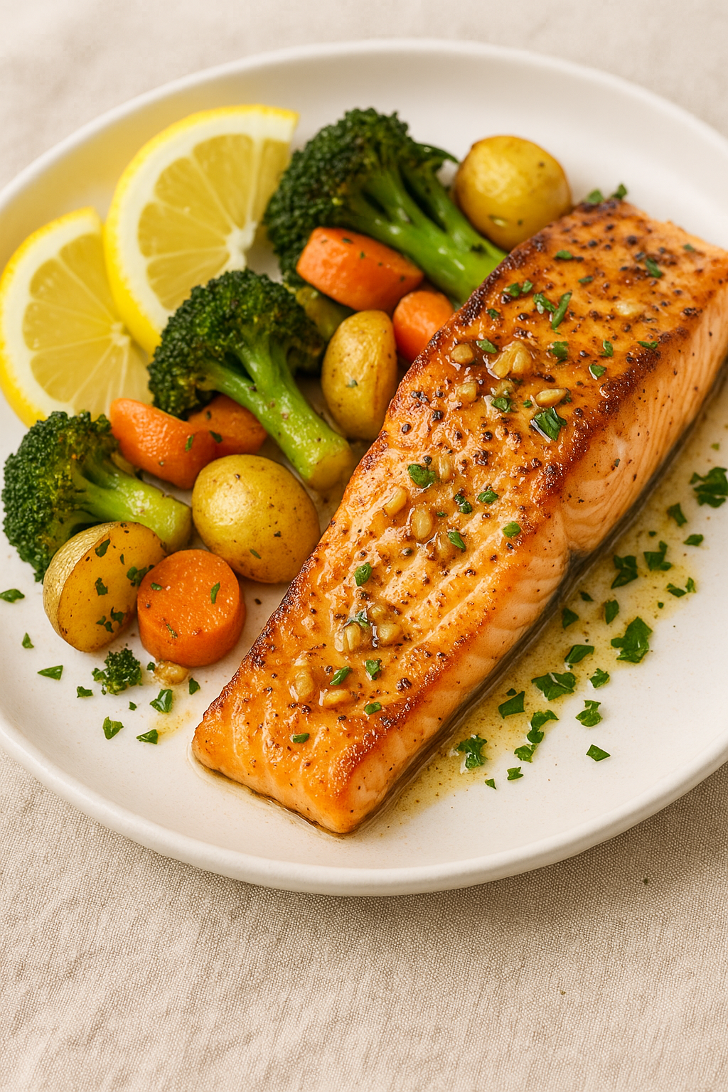 A one-pan dinner bursting with flavor — flaky garlic-butter salmon paired with tender roasted vegetables. Simple, healthy, and ready in just 30 minutes.