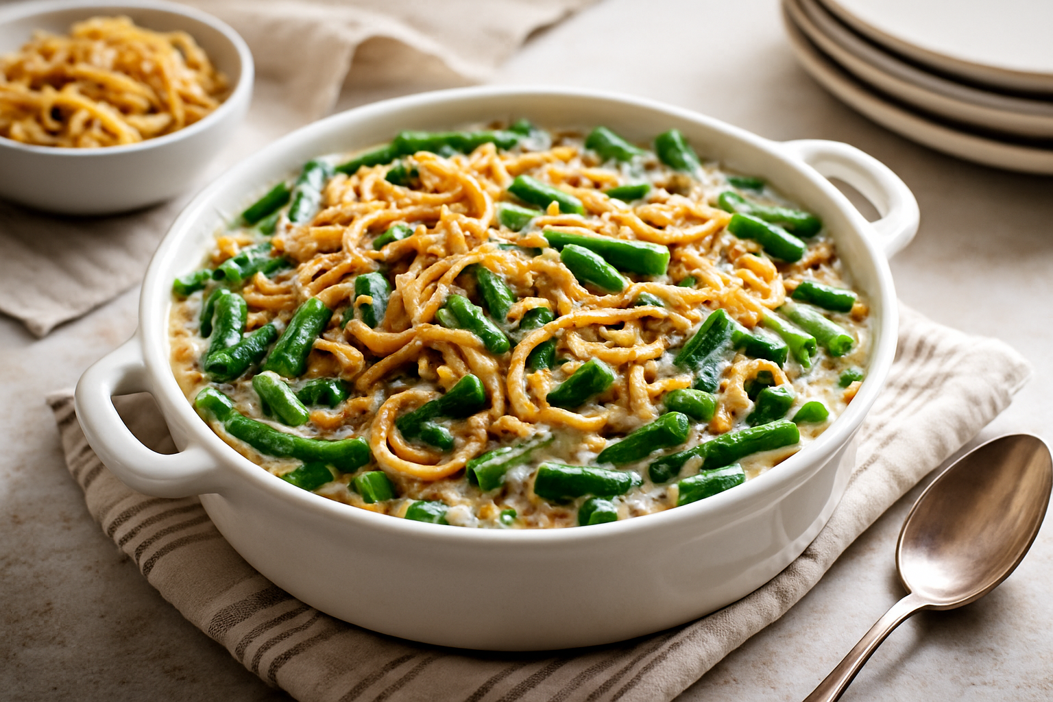 This creamy green bean casserole is a holiday favorite—rich, comforting, and topped with crispy onions for the perfect crunch.
