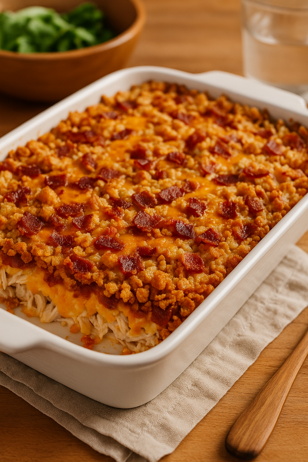 Inspired by the famous department store café, this casserole brings together shredded chicken, bacon, cheddar, a buttery cracker topping, and almonds for crunch — easy to prep, ready to bake, and loved by all.