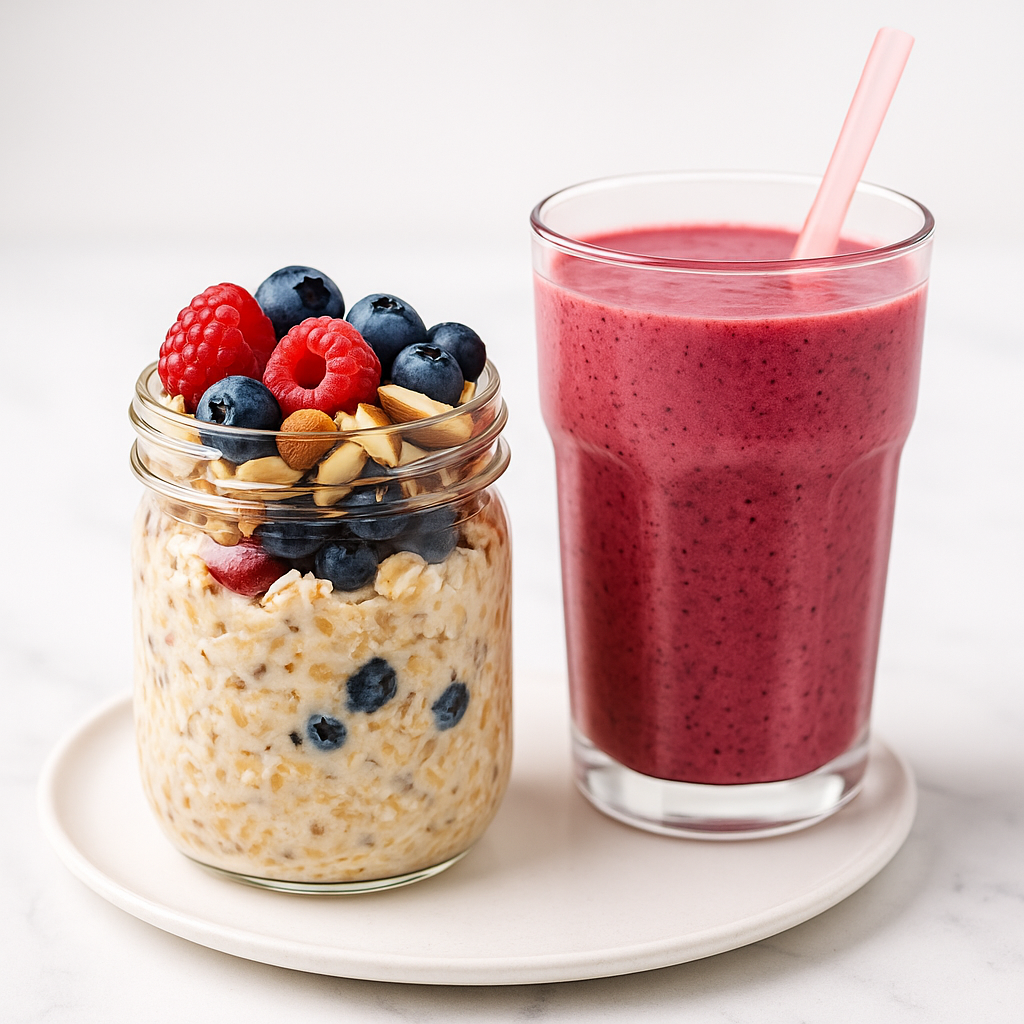 Start your morning right with this quick and nourishing duo! Whether you’re craving a creamy berry-spinach smoothie packed with antioxidants or cozy overnight oats layered with fresh fruit and crunch, these make-ahead breakfasts are simple, satisfying, and full of flavor. Perfect for busy mornings, post-workout fuel, or a healthy on-the-go option — because feeling good should taste this good.