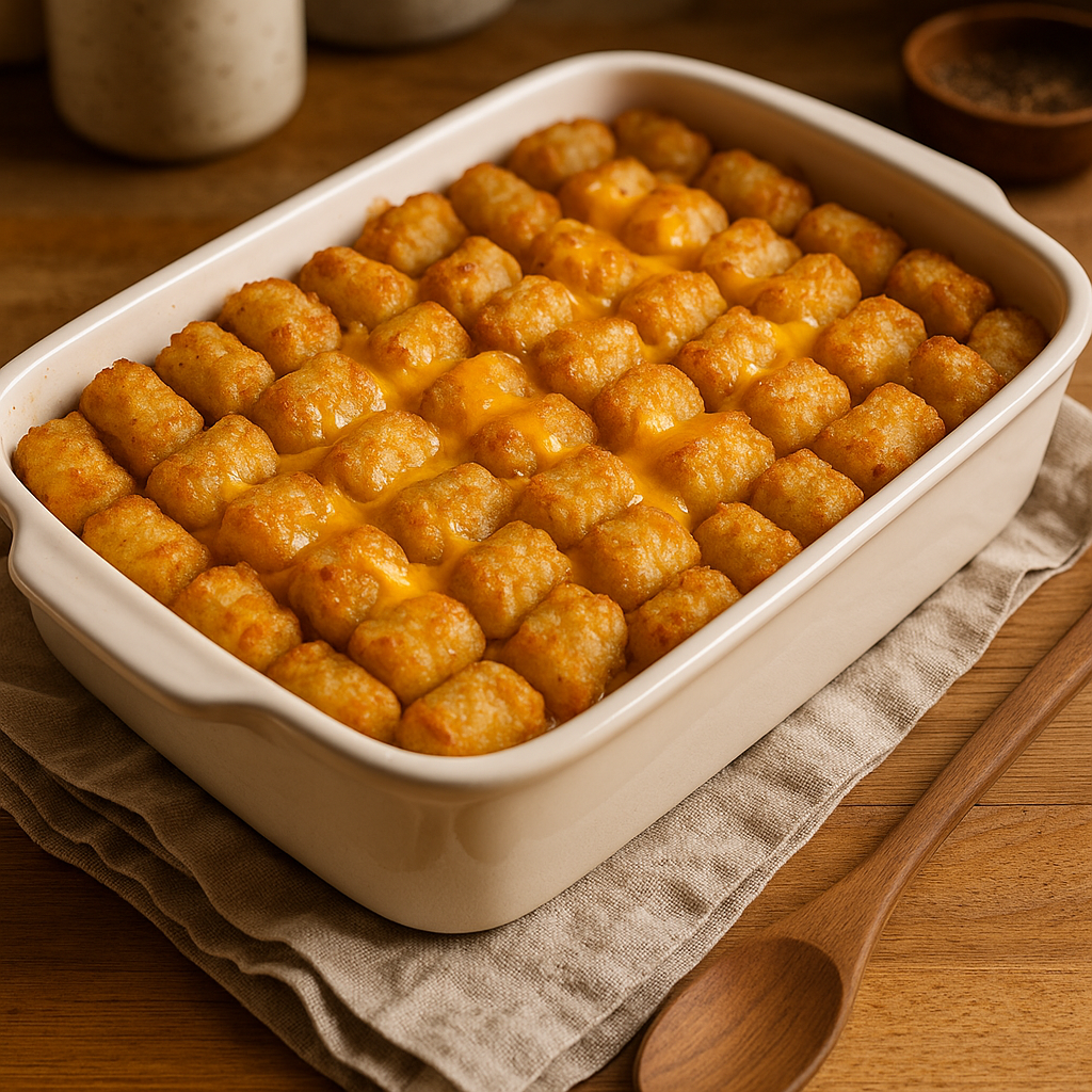 A one-dish classic that layers ground beef, creamy soup, gooey cheese, and crispy tater tots into a crowd-pleasing dinner. Quick to assemble, comforting to eat, and perfect for weeknight simplicity.